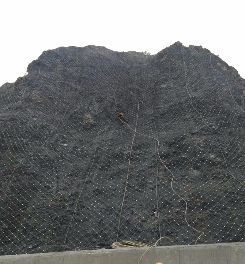 柔性防護(hù)網(wǎng)系統(tǒng)是以鋼絲繩網(wǎng)為主的各類柔性網(wǎng)覆蓋包裹在所需防護(hù)斜坡或巖石上,以限制坡面巖石土體的風(fēng)化剝落或破壞以及為巖崩塌(加固作用),或?qū)⒙涫刂朴谝欢ǚ秶鷥?nèi)運(yùn)動(dòng)(圍護(hù)作用)。